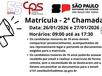 INSCRIÇÕES: 08/02/2021 a 19/02/2021Ler o Edital na íntegra (04 páginas)Não serão aceitas inscrições sem a documentação enviada para o e-mail e141acad@cps.sp.gov.brLink do Edital